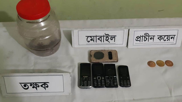 এসময় ওই বাড়ী থেকে বিরল প্রজাতির একটি তক্ষক, তিনটি ধাতব প্রাচীন মুদ্রা, পাঁচটি মোবাইল ও সাতটি সীমকার্ডসহ চোরাচালান চক্রের ওই চার সদস্যকে গ্রেফতার করা হয়।