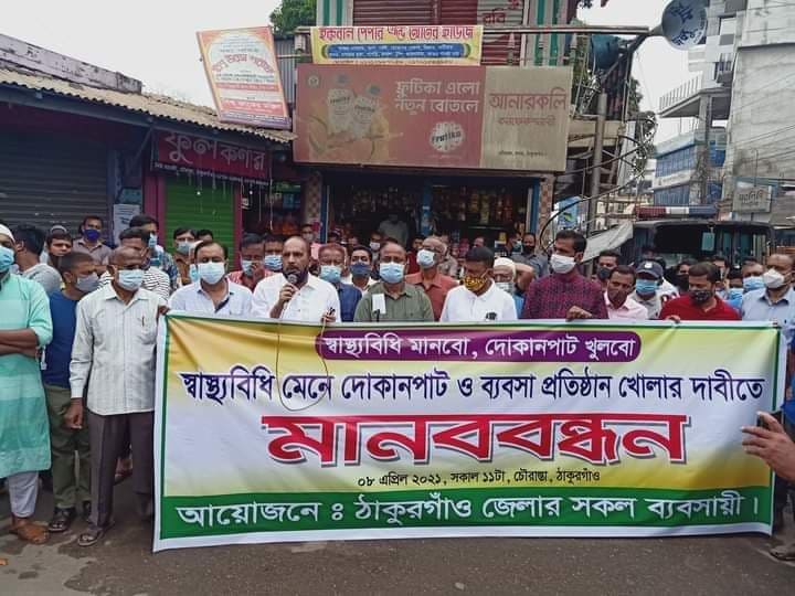 ঠাকুরগাঁওয়ের সদর পৌর শহরে বৃহস্পতিবার সকালে ব্যবসায়ী মহল ও ব্যাবসায়ী সংগঠনগুলোর উদ্যোগে মানববন্ধন কর্মসুচি পালন করে। উক্ত মানববন্ধনে ব্যাবসায়ীগণ সকল ব্যবসা প্রতিষ্ঠান খুলে দেয়ার দাবি করেন।