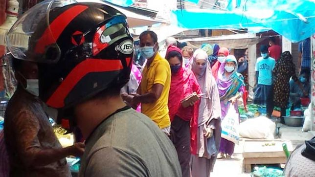 শনিবার সকাল ৭টা থেকে ১২টা পর্যন্ত বাজার খোলা থাকায় ভিড় আরো বেশি হয়েছে। চলমান সপ্তাহব্যাপী লকডাউনে জেলা প্রশাসনের নির্দেশনায় মুদি ও চালের দোকান বন্ধ থাকলেও শনিবার অনেক দোকানই এক সার্টার খুলে কেনা বেচা করে।