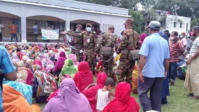 এসময় সুবিধাভোগীরা স্বাস্থ্য বিধি না মানায় পুলিশ ও সেনাবাহিনী সহযোগীতায় পরিস্থিতি স্বাভাবিক করা হয়।পরে সেনাবাহিনীর সহযোগীতায় স্বাস্থ্য বিধি মেনে সঠিকভাবে প্রথমে মহিলাদের ও পরে পুরুষদের চাল বিতরণ করা হয়।