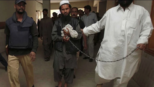 ছবিতে দেখা যাচ্ছে, পাকিস্তানের করাচিতে এক লোককে পাহারা দিয়ে নিয়ে যাচ্ছে। হাতে শিকল, কোমরে ডান্ডাবেড়ি।