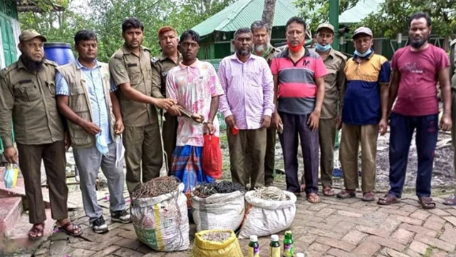 এ সময় তার কাছ থেকে তিন বোতল বিষ, তিন বস্তা হরিণ শিকারের ফাঁদ এবং কিছু মাছ উদ্ধার করা হয়।